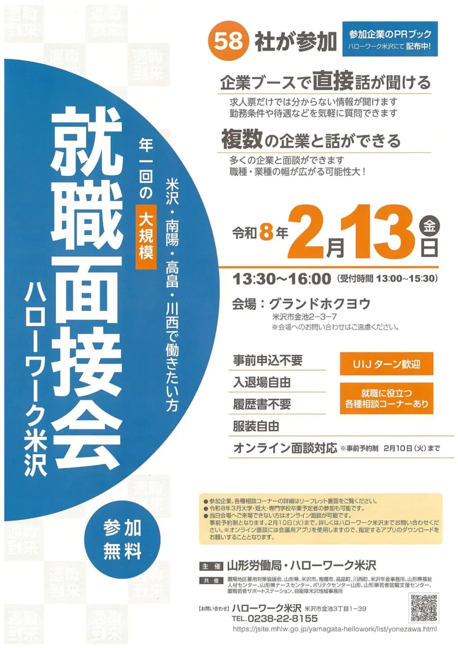 令和8年2月13日(金)に開催される、山形労働局・ハローワーク米沢主催の「就職面接会」に参加いたします。年1回の大規模イベントで、全58社が参加予定です。複数の企業と一度に面談できる貴重な機会となっています。当社からは以下の4つの職種で求人を出しております。 警備業務、清掃業務、設備管理業務、サービス支援業務 「こんな働き方は無いかな?」「こういった業種で働きたいんだけど」などなど、当日お気軽にご相談ください。当社ブースでお待ちしております。