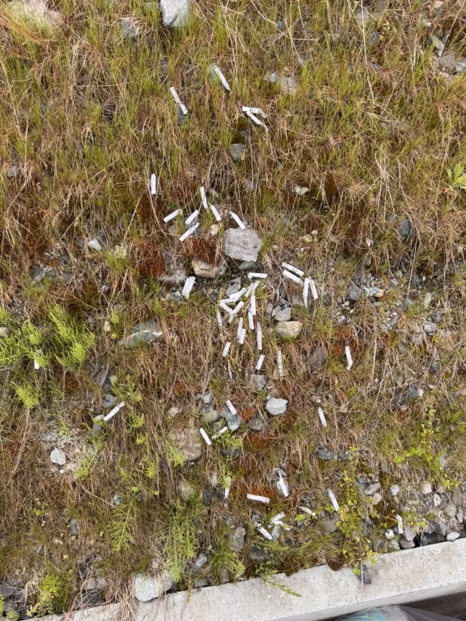 当日は10名を2班に分け、東北中央道の側道を歩きながらゴミ拾いを行いました。結果として、例年よりも多くのゴミを回収することができました。中には、写真のように吸い殻がまとめて捨てられていたり、栄養ドリンクの容器が大量に放置されていたりと、悪質なゴミも見受けられました。